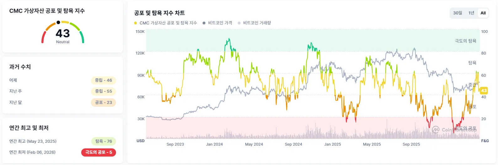 The Crypto Fear & Greed Index, compiled by data provider CoinMarketCap, has dropped three points from yesterday to 43, though it remains in the neutral stage.
