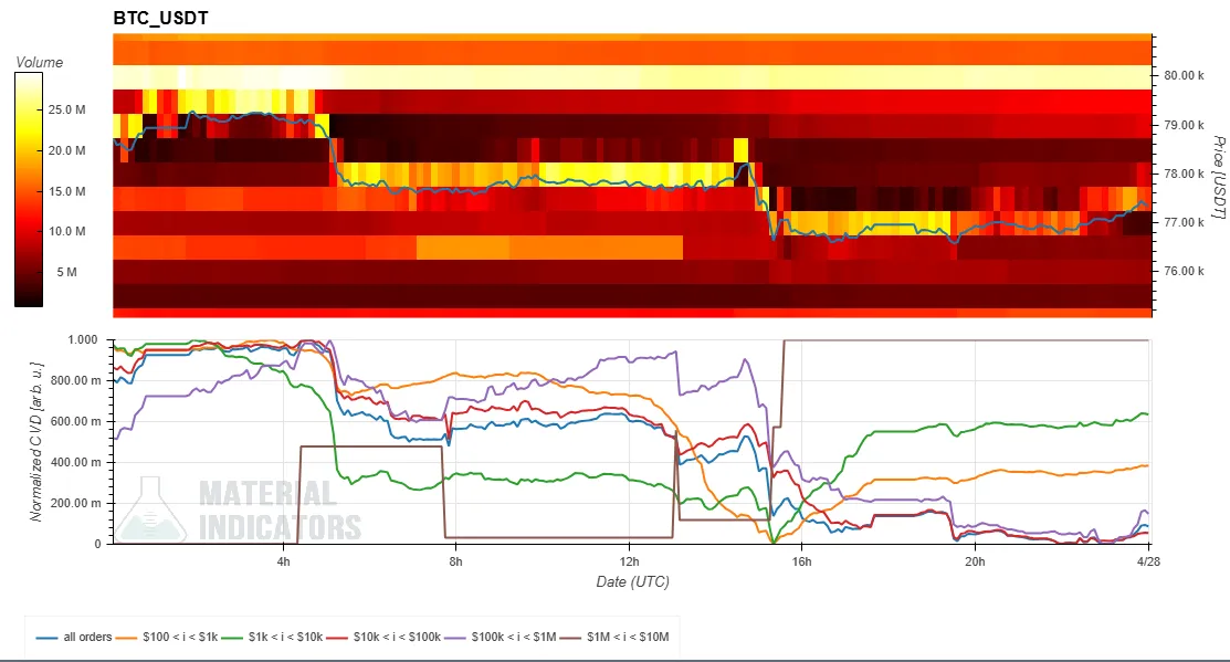 - The cumulative volume delta (CVD) indicator at the bottom represents buy and sell orders categorized by trade size. As buy orders increase, the corresponding colored line rises. The yellow line indicates orders between $100 and $1,000, and the brown line represents large orders between $1 million and $10 million.