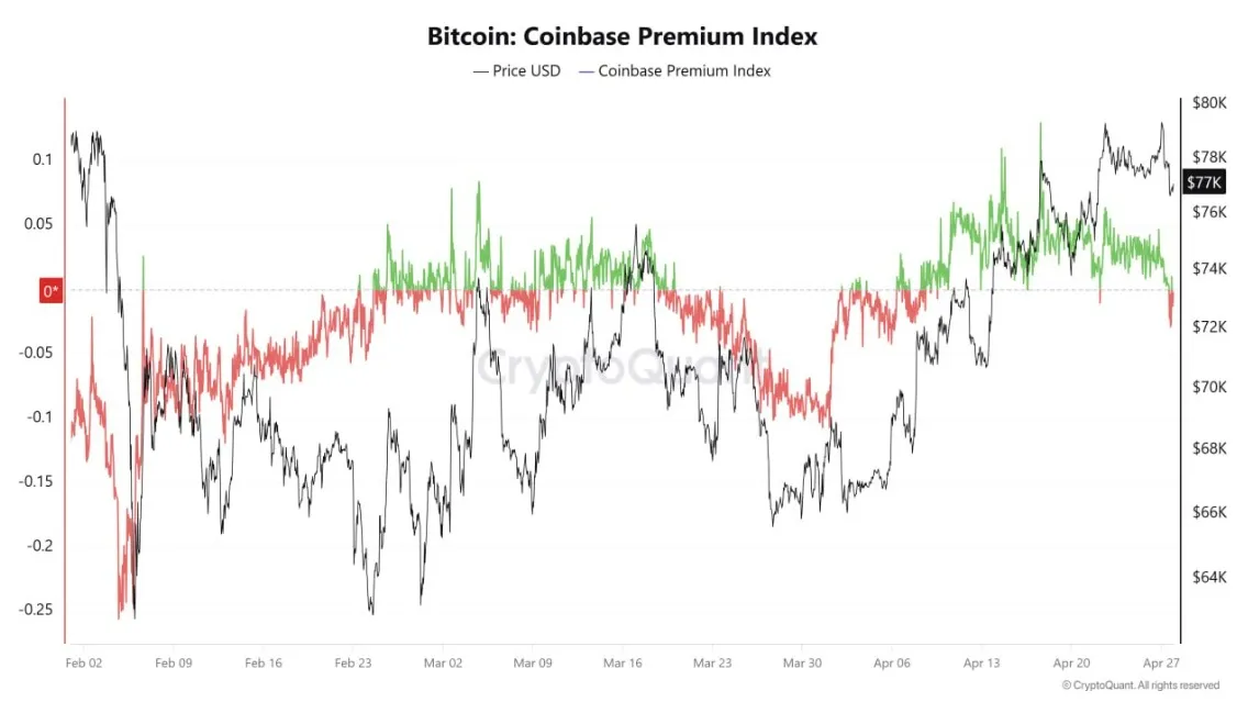 The BTC Coinbase Premium has turned negative, according to on-chain analysis account MAC.D. The account suggested this indicates that, contrary to market expectations, buying pressure from U.S. investors has decreased.