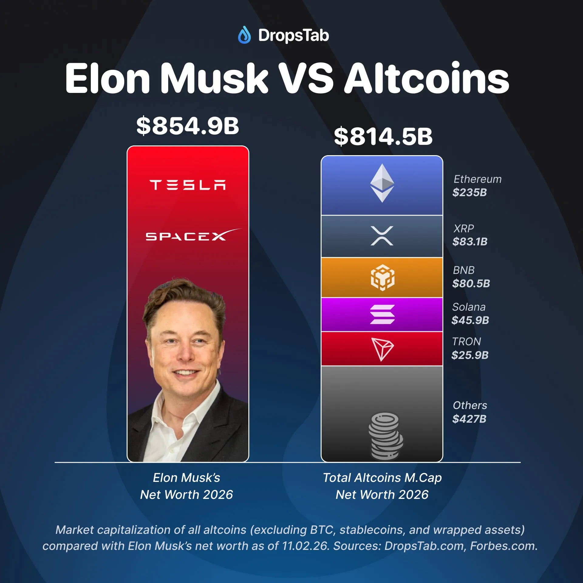 The net worth of Tesla CEO Elon Musk is greater than the combined market capitalization of all altcoins, according to data from DropsTab. Citing Forbes figures from Feb. 11, Musk's net worth stands at $854.9 billion, surpassing the total altcoin market cap of $814.5 billion. For comparison, Ethereum's market cap is $235 billion, approximately 3.6 times smaller than Musk's wealth. Other major altcoins by market cap include XRP ($83.1 billion), BNB ($80.5 billion), SOL ($45.9 billion), and TRON ($25.9 billion).