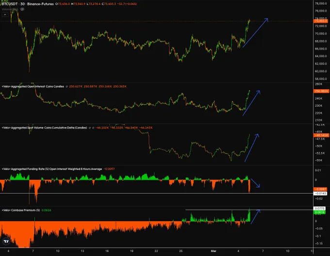 Despite aggressive short-selling in the cryptocurrency market, key indicators are signaling a healthy rally, cryptocurrency analyst Sykodelic said on X. He noted that Open Interest (OI) and leverage ratios are currently rising in tandem with the price. In particular, spot trading volume is growing alongside the price increase, underpinning the buying pressure. Conversely, funding rates are strongly negative, suggesting that a majority of traders are betting on short positions. The Coinbase Premium, which indicates U.S.-based buying pressure, is also in positive territory. Sykodelic interpreted this as a market with solid spot buying, while leveraged positions are concentrated on the short side. He predicted that if spot buying continues to push prices higher, a short squeeze could occur.