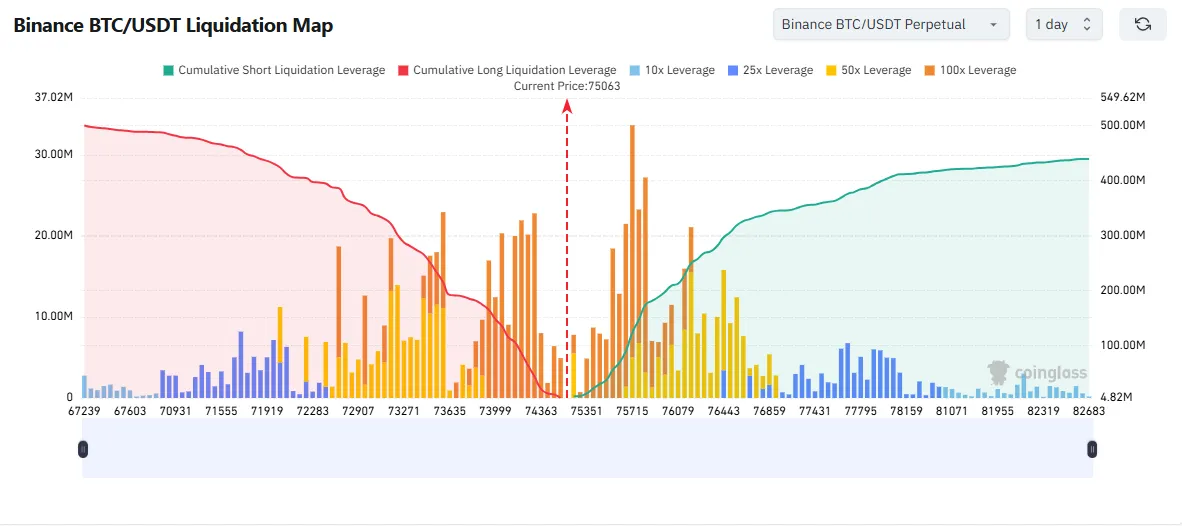 According to data from CoinGlass, approximately $123.74 million in short positions on major centralized exchanges will be liquidated if BTC breaks through $75,715. Conversely, a drop below $73,583 would trigger the liquidation of $215 million in long positions.