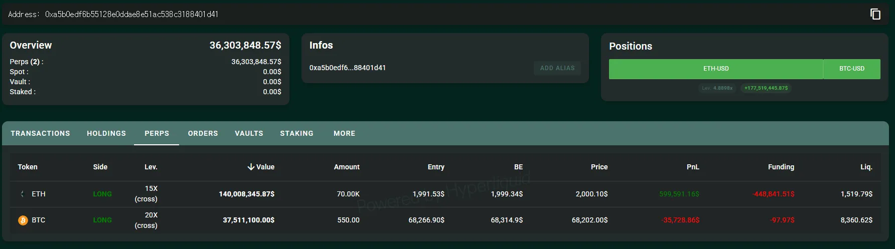 An anonymous whale or institution has opened an additional 20x long position of 550 BTC, worth $37.45 million, on Hyperliquid at an average price of $68,266.9, according to EmberCN. The same address is also currently holding a 15x ETH long position valued at $139 million.