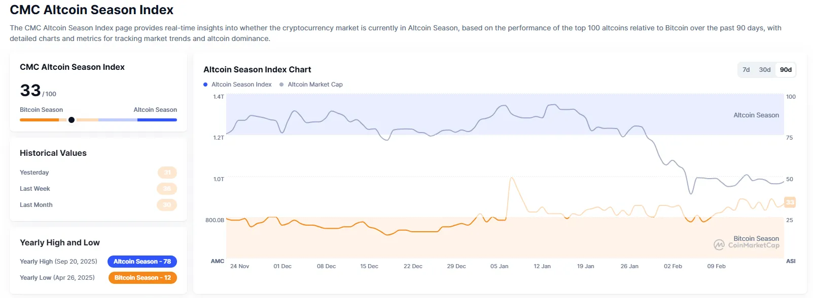 The Altcoin Season Index from crypto data aggregator CoinMarketCap has dropped two points from yesterday to 33. The index measures market sentiment by comparing the performance of the top 100 cryptocurrencies by market capitalization, excluding stablecoins and wrapped tokens, against Bitcoin over the past 90 days. An 'altcoin season' is declared when 75% of these top altcoins outperform Bitcoin during that period. A score closer to 100 indicates a stronger altcoin season.