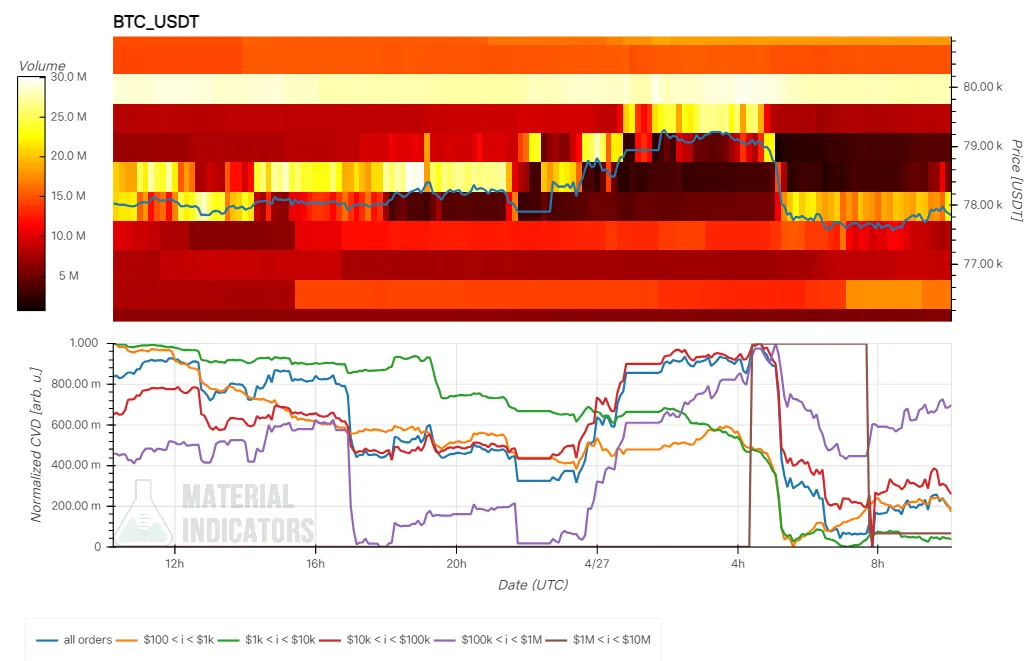 - The CVD indicator represents buy and sell orders categorized by trade size. As buy orders increase, the corresponding colored line rises. The yellow line tracks orders between $100 and $1,000, while the brown line tracks large orders between $1 million and $10 million.