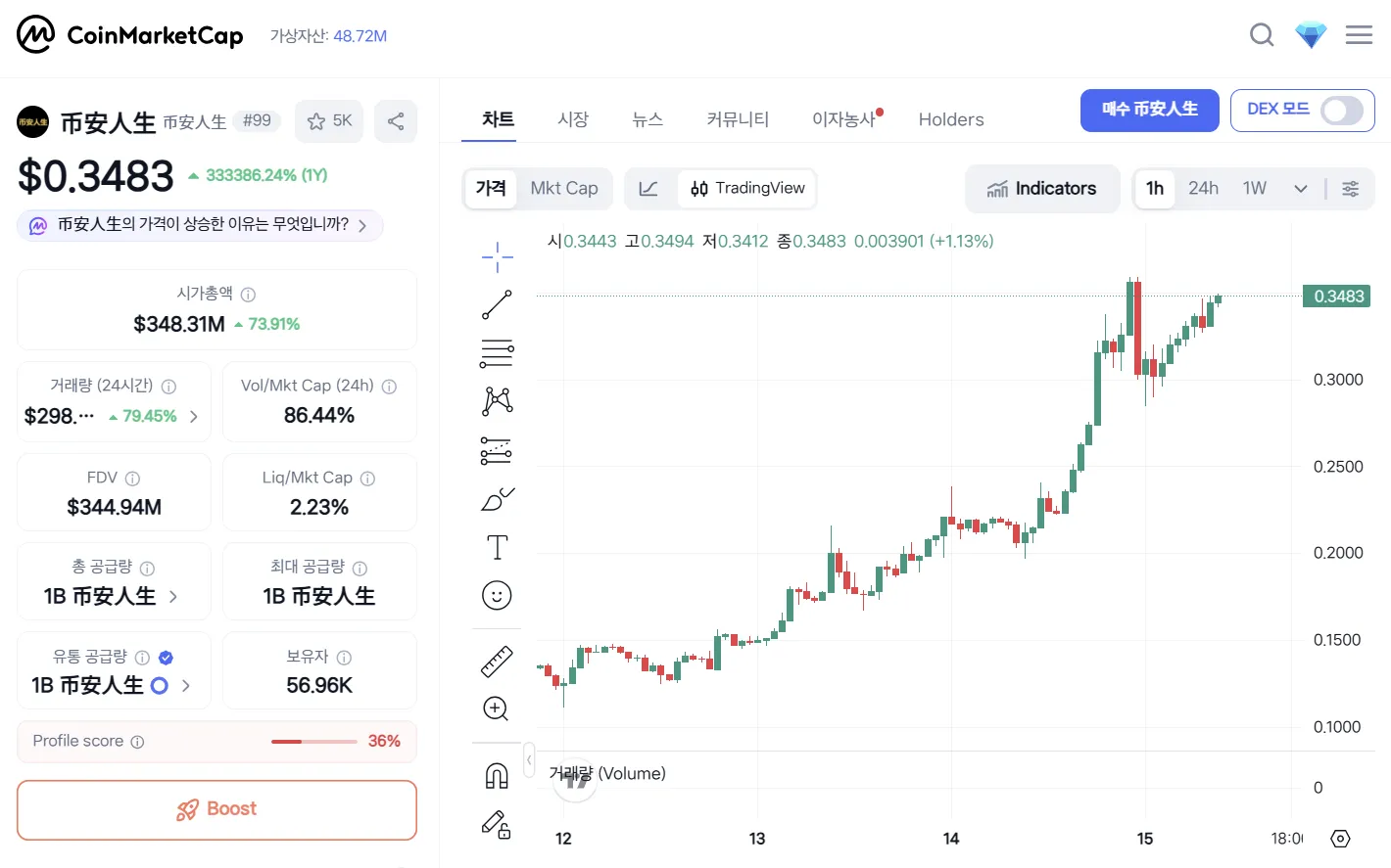 The meme coin 币安人生, named after the memoir of Binance founder Changpeng Zhao, has climbed to 99th in overall cryptocurrency market capitalization following a surge of approximately 393% over the past seven days. It is currently trading at $0.3475, up 75.55% in the last 24 hours, with a market cap of about $350 million.
