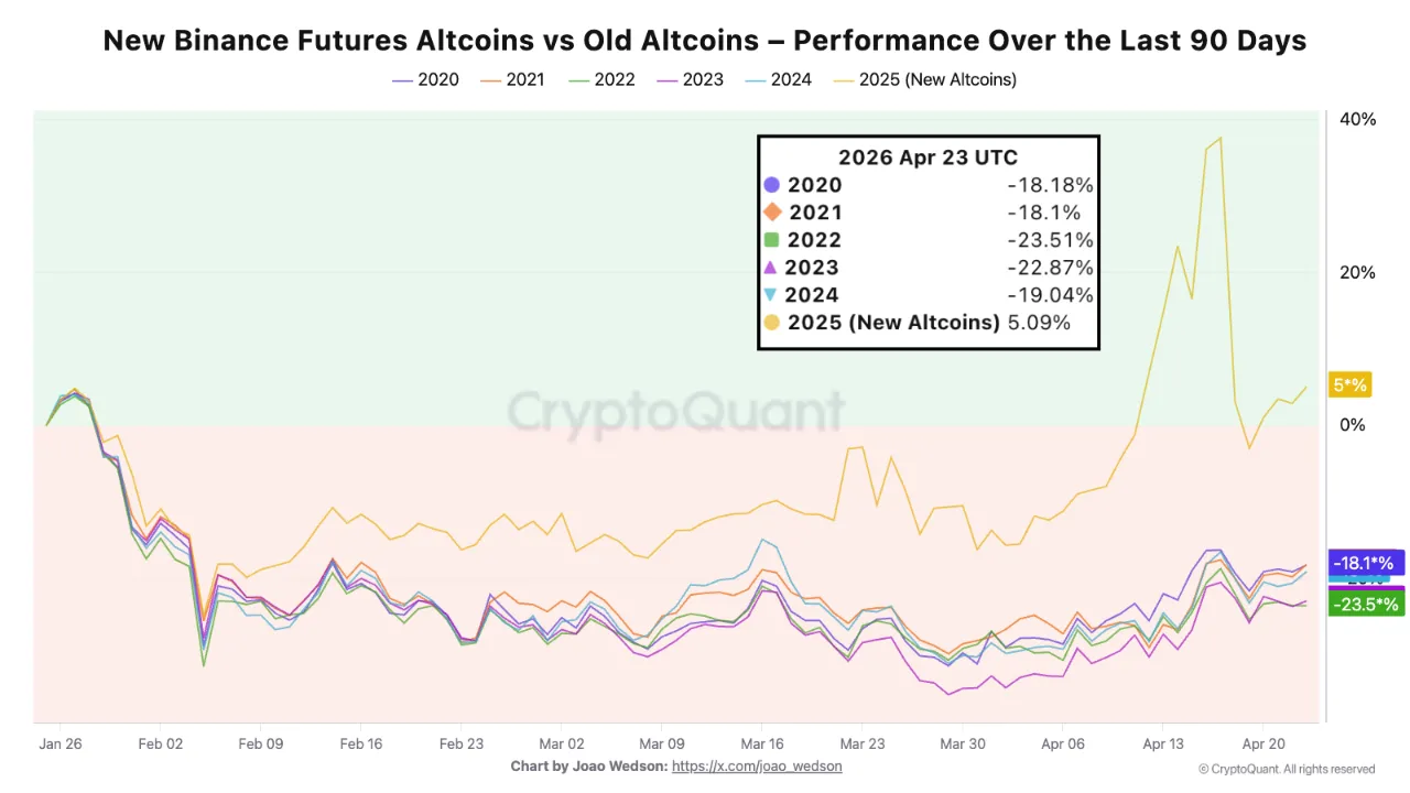 While altcoins launched last year have posted an average gain of around 5%, those released between 2020 and 2024 are down by an average of 18% to 23%, according to a CryptoQuant contribution from crypto analyst MorenoDV. He explained that this indicates a strong trend in the altcoin market toward chasing immediate hype and the liquidity from new listings. MorenoDV argued that "alt season" is no longer a phase where all assets rise together but has been reshaped into a selective process where capital flows only to assets with new narratives. The current market, he added, has become a battlefield for short-term attention rather than a competition based on long-term fundamentals. The analyst concluded that the future market structure will be determined by whether the cryptocurrencies launched last year can defend their gains during future periods of volatility.