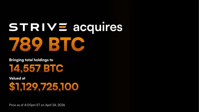 Bitcoin accumulation firm Strive (ASST) has purchased an additional 789 BTC, worth $61.43 million, at an average price of $77,890, CEO Matt Cole announced on X. As of April 24, Strive holds 14,557 BTC, valued at approximately $1.13 billion.