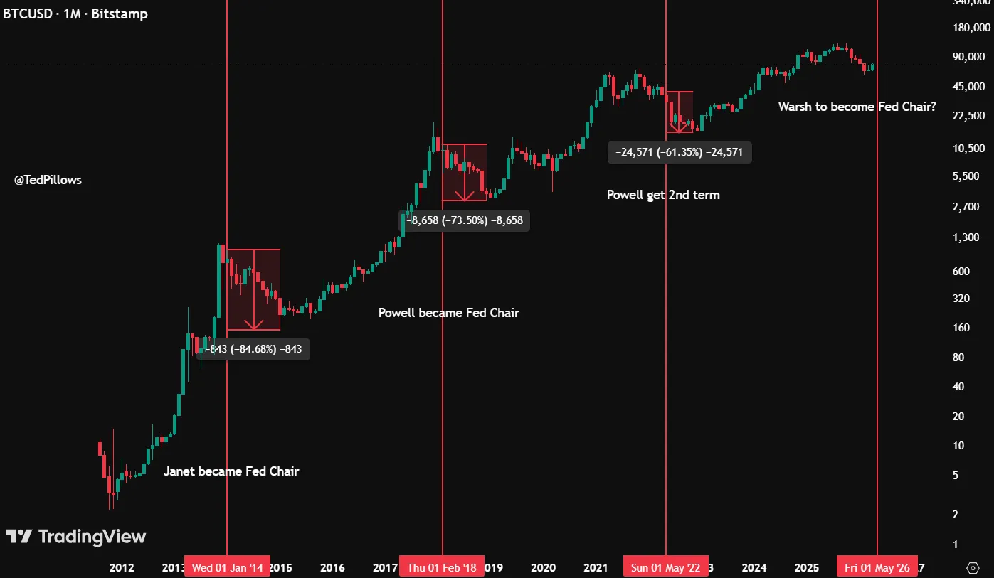 Crypto influencer Ted Pillows said on X that Bitcoin has historically always fallen around the time of a leadership change at the U.S. Federal Reserve. He noted that when Janet Yellen took office as Fed Chair in January 2014, BTC fell 84%. Similarly, the asset dropped 73% when Jerome Powell began his term in February 2018 and 61% when Powell was reappointed for a second term in May 2022. Pillows added that he is curious to see what will happen with the transition to Kevin Warsh. Powell's current term as chair is set to end on May 15. U.S. President Donald Trump has nominated Warsh to be the next Fed Chair, though the nomination has not yet been confirmed by the Senate. If the confirmation process is not completed by then, Powell is expected to continue as an interim chair. His term as a Fed Governor extends until January 2028, allowing him to remain on the board.