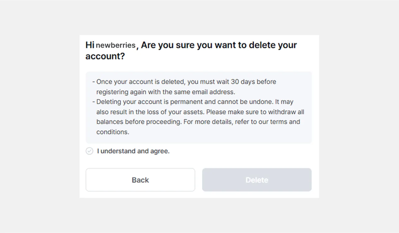 Kapag tinanggal mo ang iyong account, pareho ang Coinness at Coinness Exchange account mo ay permanenteng mabubura.