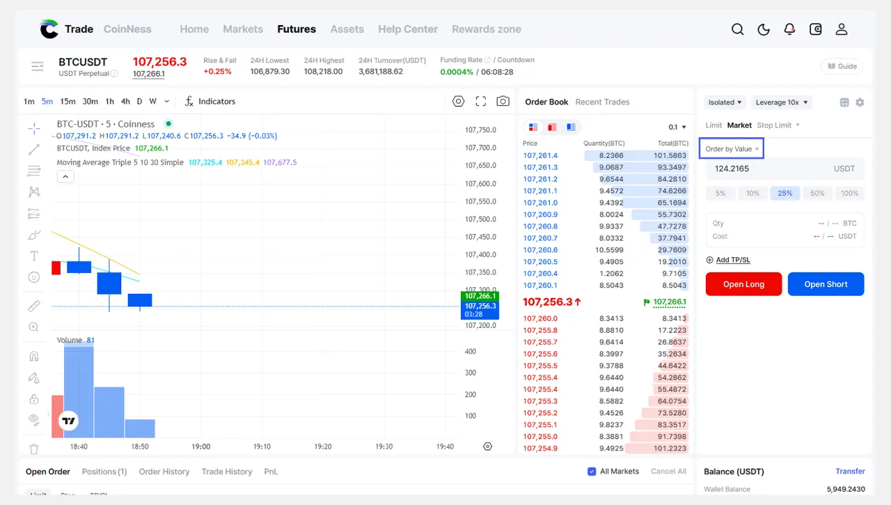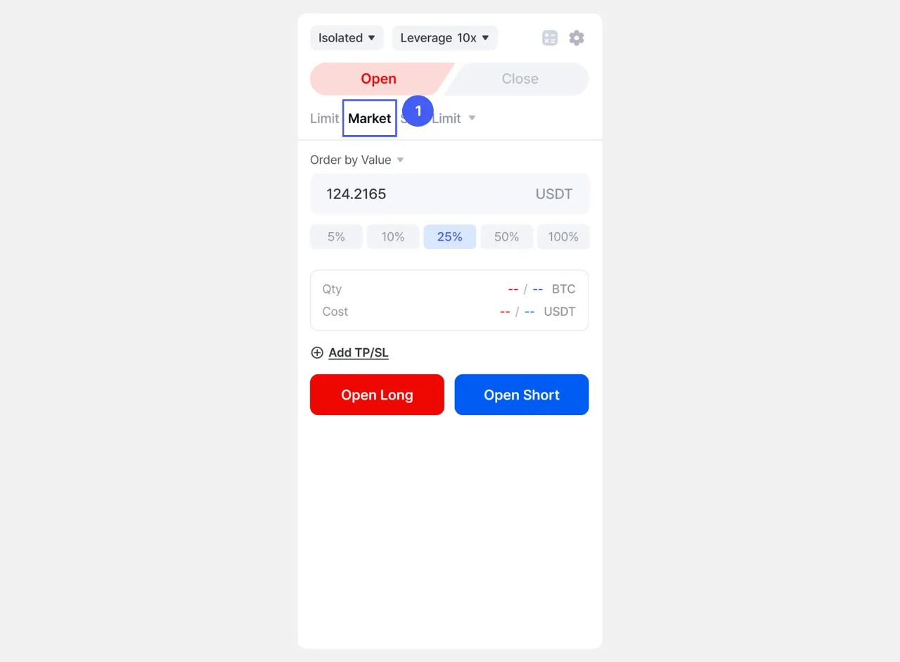 1. Sa pahina ng [Futures], pumunta sa order panel at piliin ang Market bilang uri ng order.