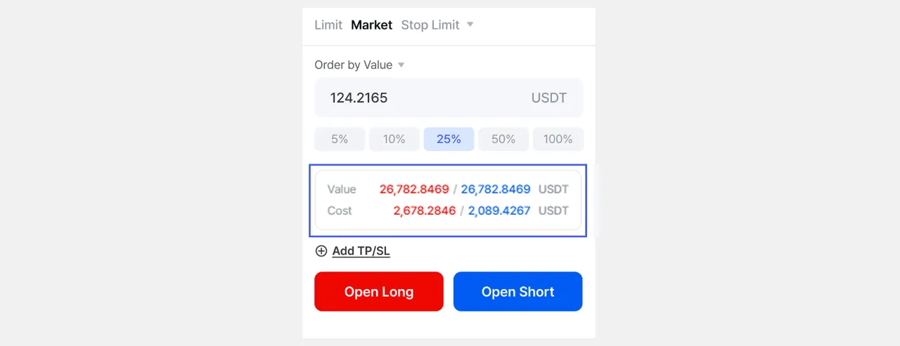 • Dami/Halaga (Order Quantity) ◦ Tingnan ang na-convert na halaga ng dami ng order na inilagay mo ◦ Halimbawa: Kung naglagay ka ng dami sa USDT, makikita mo ito sa BTC • Gastos (Margin) ◦ Suriin ang margin na gagamitin para buksan ang posisyon