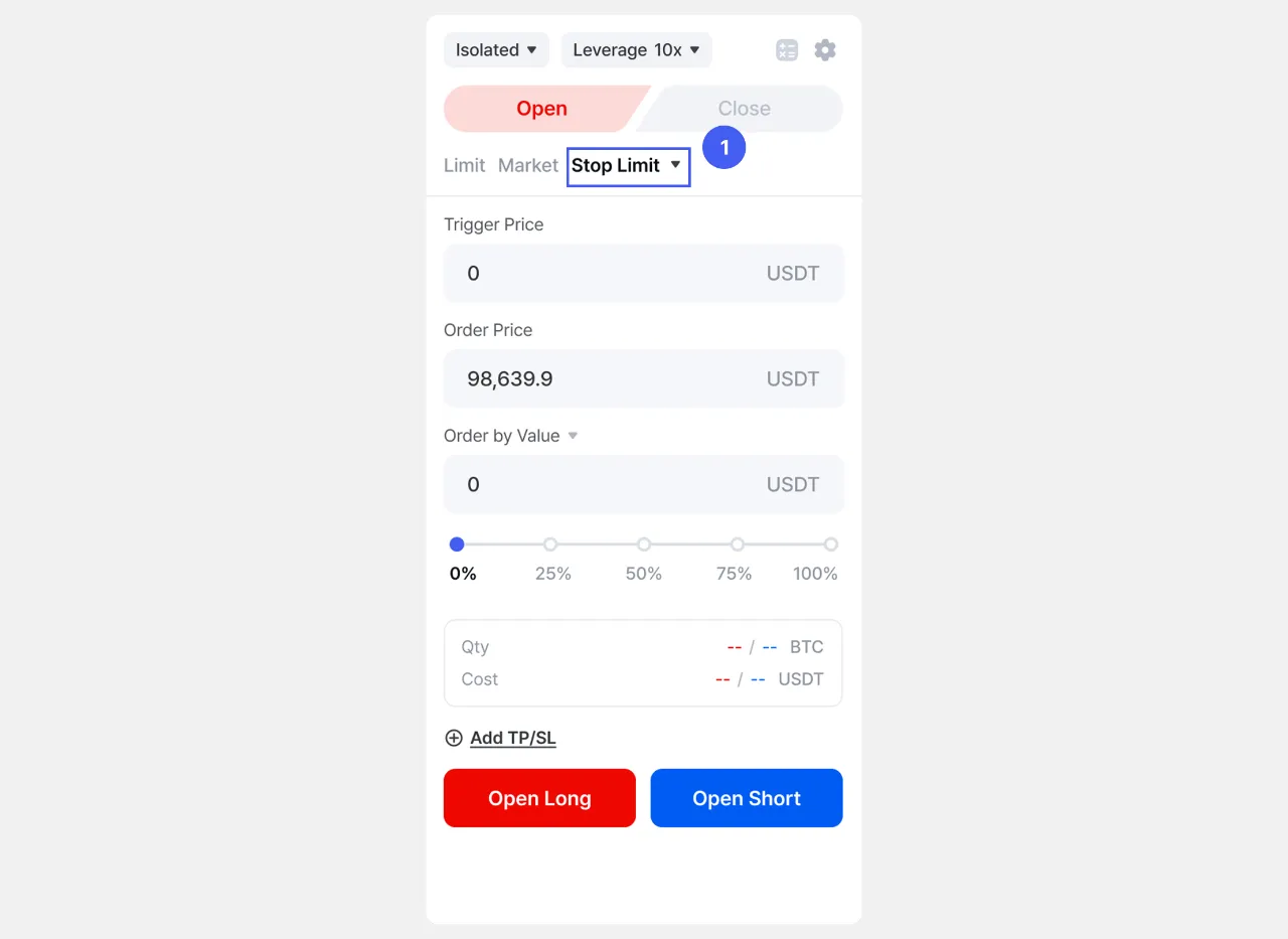 1. Sa pahina ng [Futures], pumunta sa panel at piliin ang Stop Limit bilang uri ng order