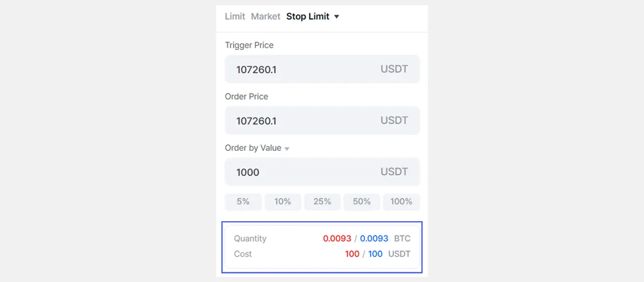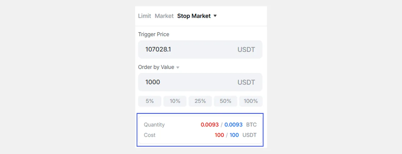 💡Depende sa paraan ng pag-input, ang order quantity at margin ay awtomatikong kinukwenta at ipinapakita • Quantity/Halaga ◦ Tingnan ang converted value ng daming inilagay mo • Gastos (Margin) ◦ Tingnan ang margin na kakailanganin para sa posisyon ⚠️Tandaan: Ang mga numero ay tantya lamang para sa sanggunian at maaaring iba sa aktwal na halaga. Mag-ingat sa pagte-trade