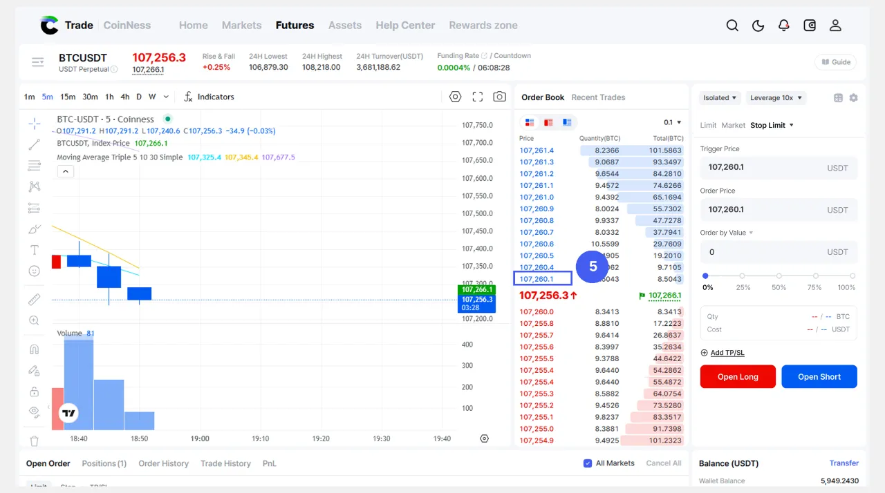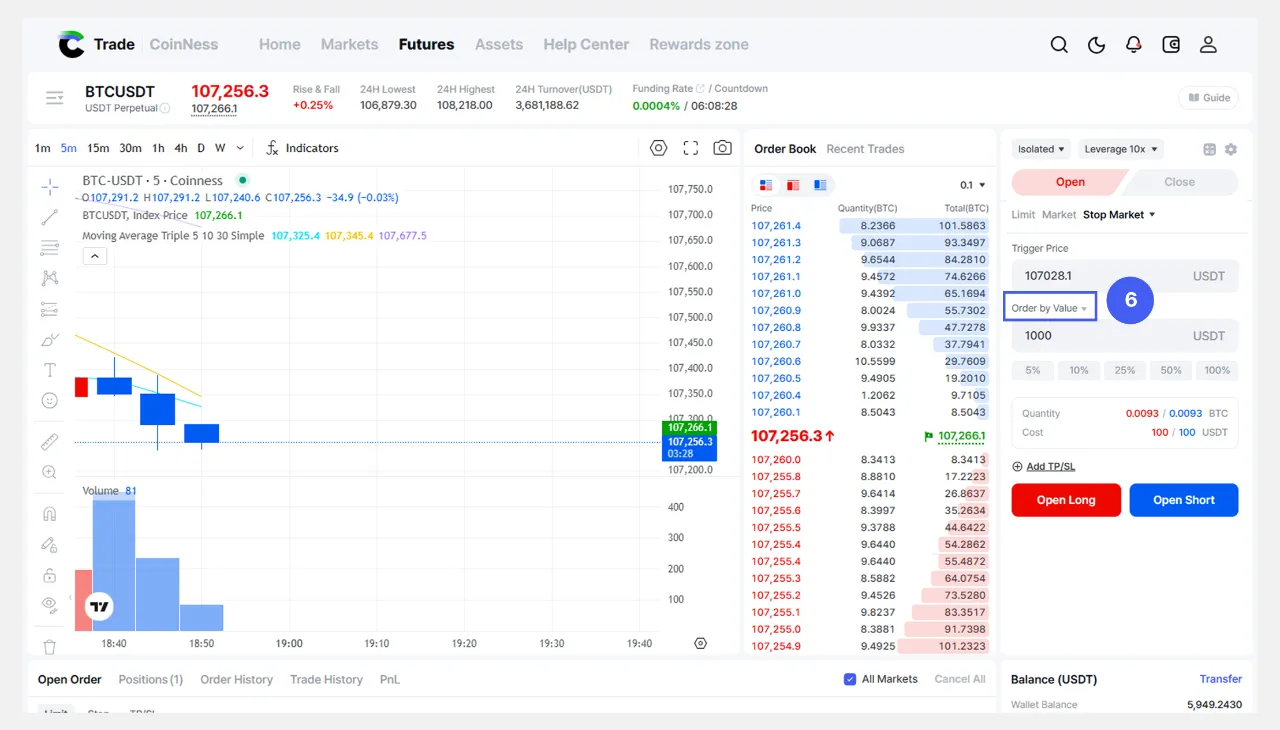 💡Halimbawa, kung nais mong pumasok sa long position kapag ang presyo ng Bitcoin ay lumagpas sa 100,000 USDT, maaari mong itakda ang 100,000 USDT bilang iyong Trigger.