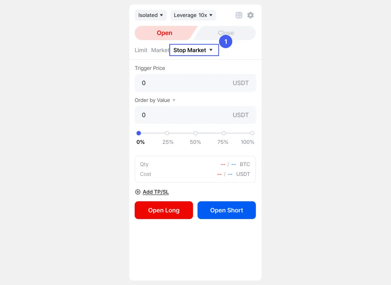 1. Sa pahina ng [Futures], pumunta sa order panel at piliin ang Stop Market bilang uri ng order