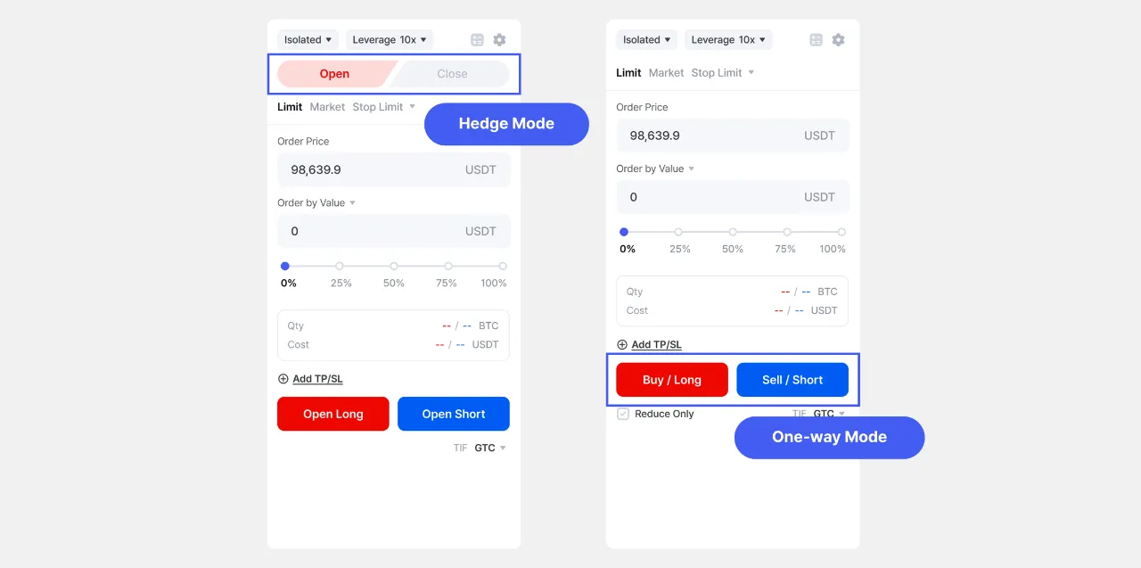• Sa halip, ang mga order button sa ibaba ay ipapakita bilang Buy/Long at Sell/Short, pinapayagan kang magkaroon ng isang direksyong posisyon lamang at awtomatikong magpapalit kapag naglagay ka ng kabaligtarang order.