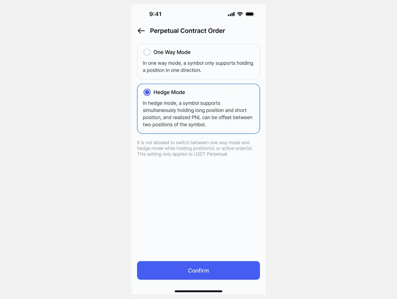 ⚠️ Maaaring itakda ang Position Mode para sa bawat trading pair, at maaari lamang itong baguhin kapag walang bukas na order o posisyon.