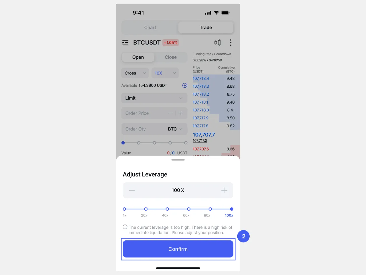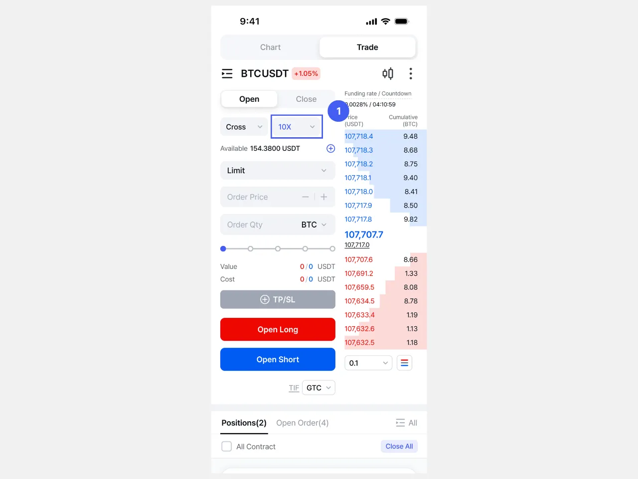 Sa BTCUSDT trading pair, maaaring magtakda ng leverage mula 1x hanggang 100x, ngunit bawat trading pair ay may iba’t ibang maximum leverage.