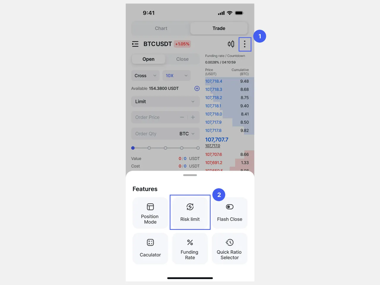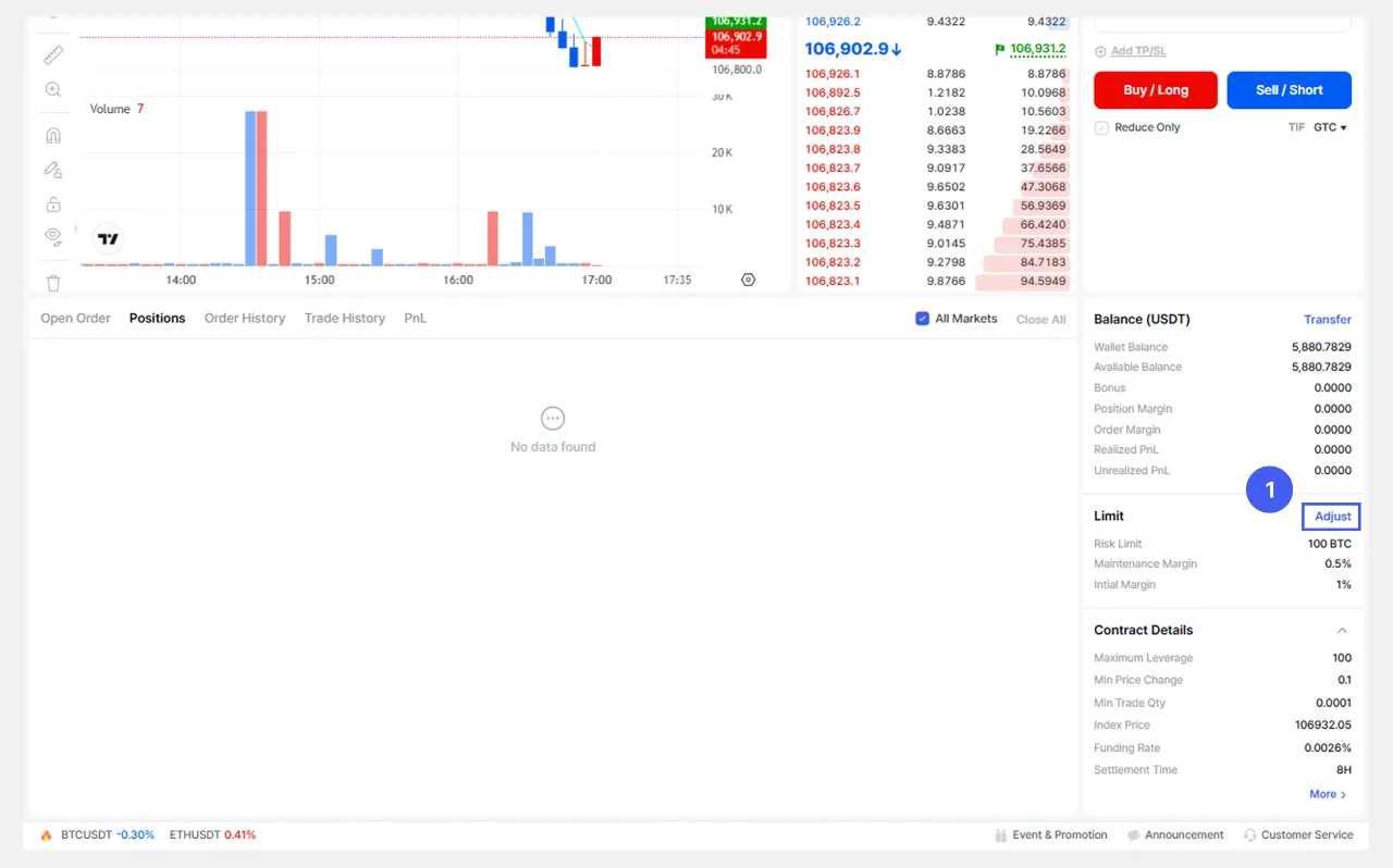 1. Piliin ang [Adjust] sa Limit area sa kanang ibabang bahagi ng [Futures] screen.
