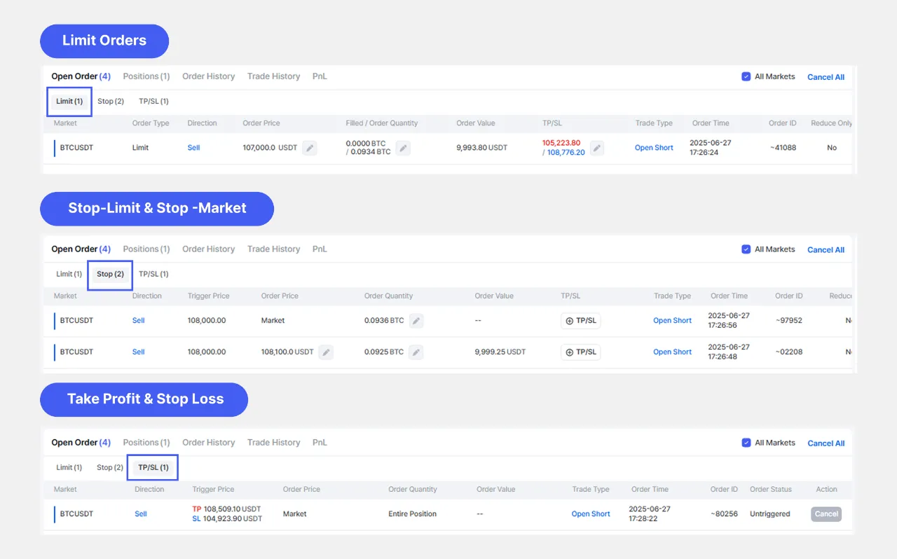 ⚠️ Maaari mong kanselahin o i-modify ang order sa real-time mula sa Open Orders tab.
