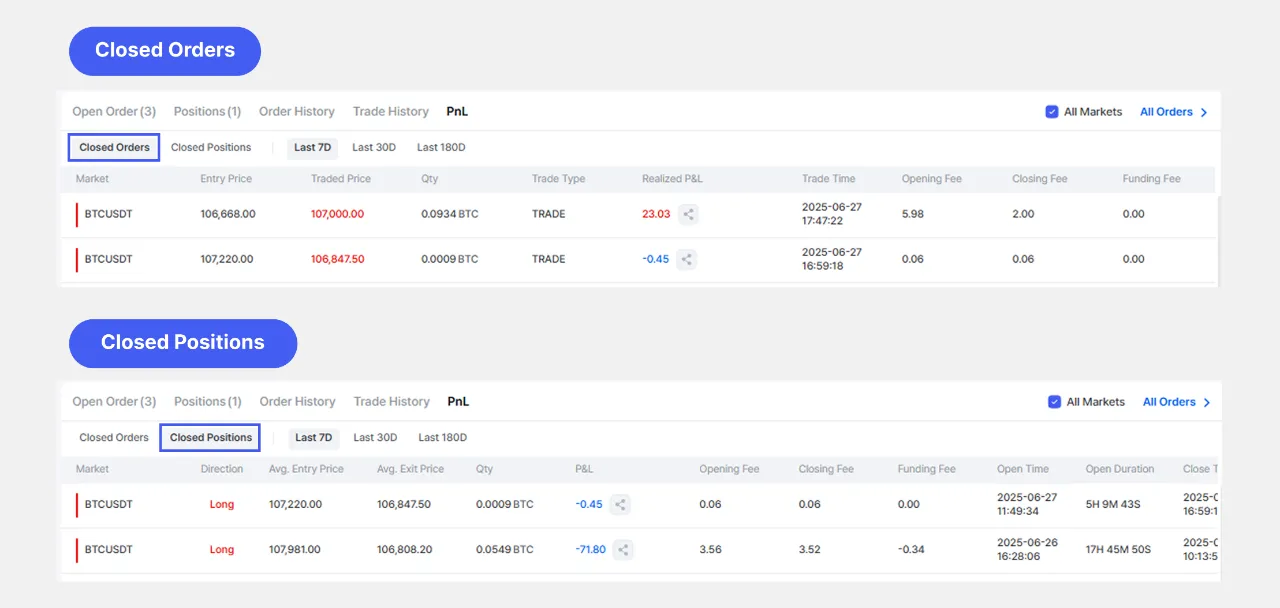 Tab ng Closed Positions: Ipinapakita ang mga trade na tuluyang naisara batay sa bawat posisyon. Maaari mong makita kung kailan ito pumasok at lumabas.