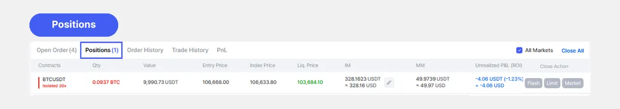 | Flash | Isang mabilis na feature ng pag-liquidate na nagpapahintulot sa iyo na agad na isara ang buong posisyon sa market price. |