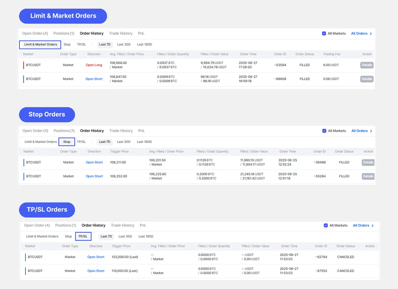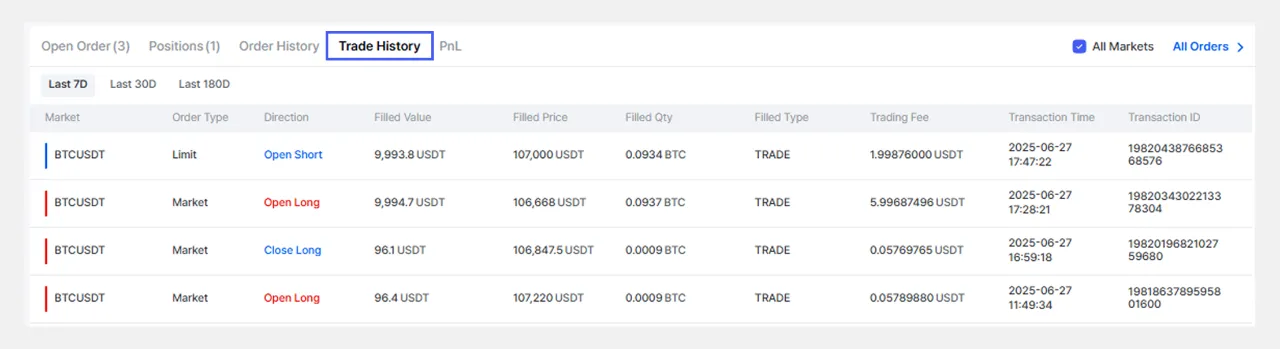 Piliin ang [Lahat] upang makita ang [Order History], [Trade History], at [P&L]