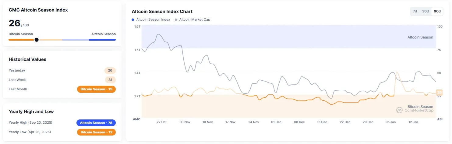 CoinMarketCap's Altcoin Season Index has risen one point from the previous day to 26. The index measures whether it is an "altcoin season" or a "Bitcoin season." An altcoin season is declared when 75% of the top 100 coins by market capitalization, excluding stablecoins and wrapped coins, outperform Bitcoin over a 90-day period. A score closer to 100 indicates a stronger altcoin season.