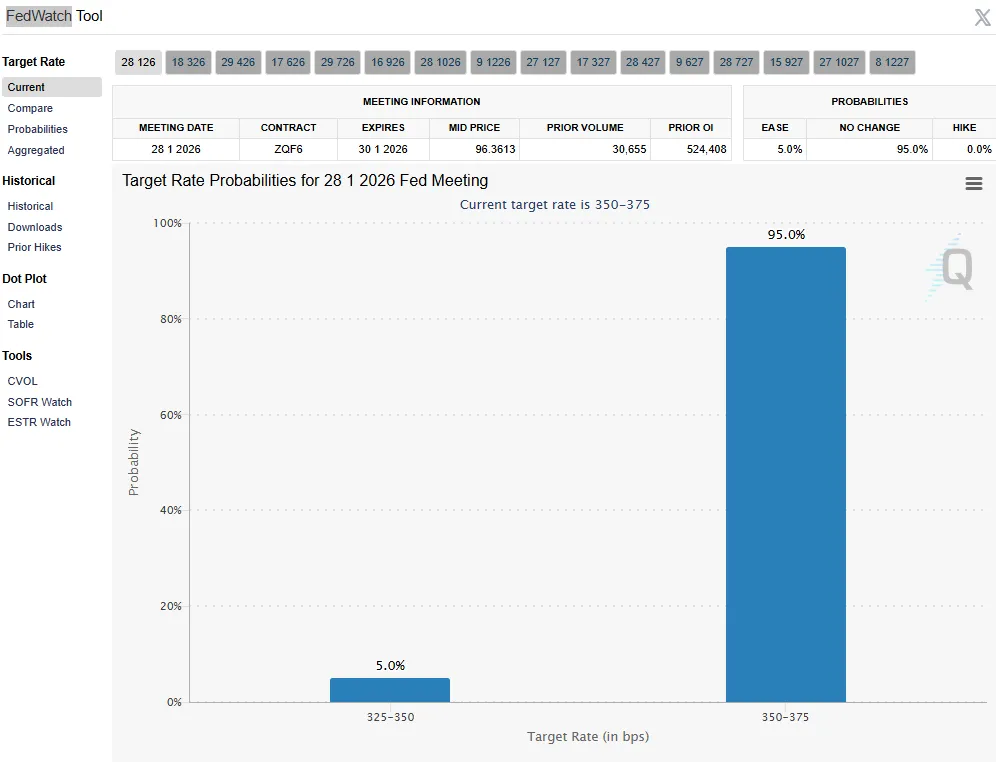 Traders are pricing in a 95% probability that the U.S. Federal Reserve (Fed) will hold interest rates steady at its upcoming Federal Open Market Committee (FOMC) meeting on Jan. 27-28, according to the CME FedWatch Tool.