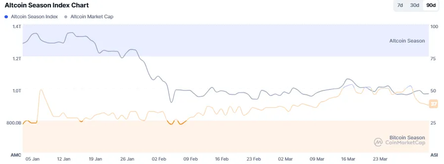 仮想資産総合情報プラットフォームのCoinMarketCapは、「アルトコインシーズン指数」が前日比1ポイント下落の37を記録したと報じた。