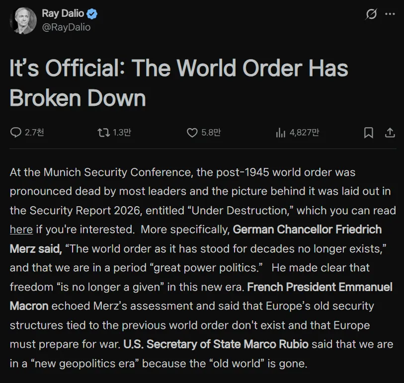 ダリオ氏は以前、X(旧Twitter)で「第二次世界大戦後に形成された世界秩序が崩壊しつつある。明確なルールではなく力の論理が支配し、大国間の衝突が頻繁になるだろう。ほとんどの重大な紛争は軍事行動に先立ち経済的圧迫から始まる。過去の1930年代の世界恐慌後、世界大戦勃発前の状況と類似した構造的条件が整った」と述べていた経緯がある。