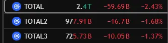 5일 암호화폐 시장에서 비트코인의 하락률이 이더리움(ETH)이나 기타 알트코인보다 큰 것으로 나타났다. 트레이딩뷰 데이터에 따르면 전체 암호화폐 시가총액을 의미하는 TOTAL은 2.43% 내린 약 2조4000억 달러를 기록하고 있다. 반면 BTC를 제외한 암호화폐 시총인 TOTAL2는 1.68% 내린 9779억1000만 달러를 기록 중이다. 또 BTC, ETH를 제외한 암호화폐 시총을 의미하는 TOTAL3는 1.37% 내린 7257억3000만 달러로 나타났다. 현재 BTC 도미넌스는 -0.53% 내린 59.17을 기록 중이다.