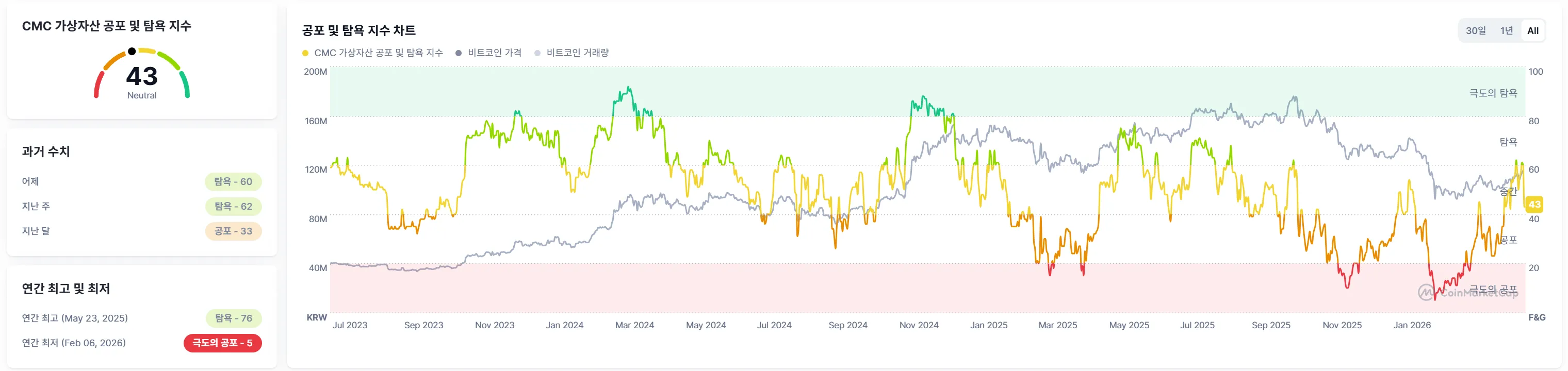 暗号資産データ提供会社CoinMarketCap(コインマーケットキャップ)の独自推計「恐怖・貪欲指数」は、前日比17ポイント低下し43を記録した。投資家心理が悪化し、貪欲段階から中立段階へと転換した。