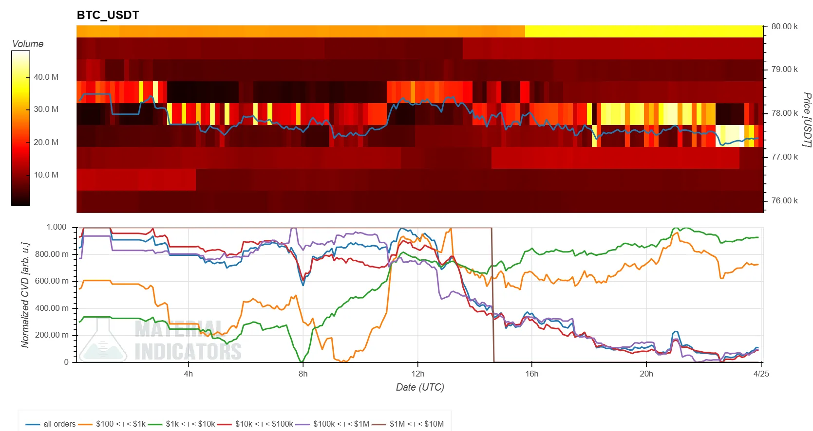 現物CVDは、BTC/USDT現物ペアのオーダーブック分析チャートであり、上段は取引量ヒートマップ(Volume Heatmap)を、下段は累積取引量デルタ(CVD)を意味する。