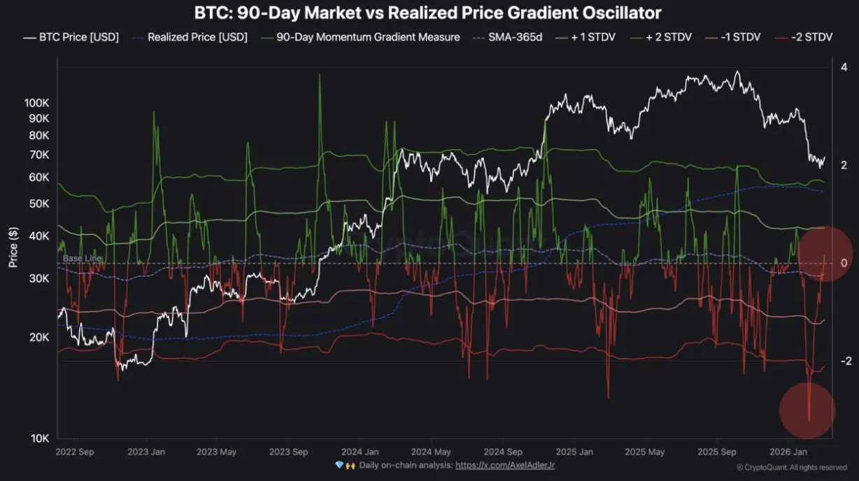 クリプトクアント(CryptoQuant)の寄稿者ルガリサーチ(RugaResearch)は、ビットコイン(BTC)の90日市場価格・実現価格傾きオシレーターが0.07に再びプラス転換したと分析した。