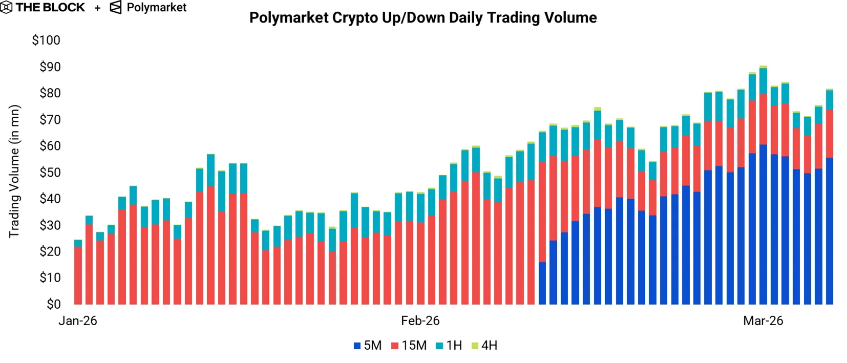 PolyMarketの5分単位暗号資産価格予測市場は、リリースから1ヶ月で1日あたり6,000万ドルの取引量を記録したと、ザ・ブロック(The Block)が報じた。