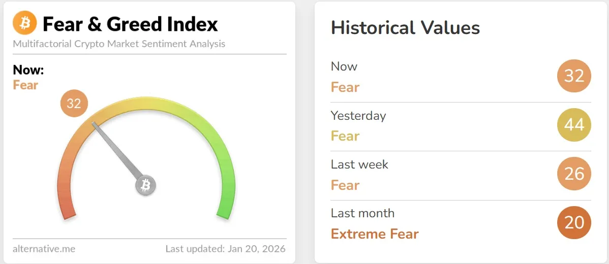 暗号資産データ提供会社オルタナティブ(Alternative)の独自推計「恐怖・貪欲指数」が前日より12ポイント下落し32を記録した。恐怖段階が続いた。同指数は0に近いほど市場の極端な恐怖を示し、100に近いほど極端な楽観を意味する。恐怖貪欲指数は変動性(25%)、取引量(25%)、SNS言及量(15%)、アンケート(15%)、ビットコイン時価総額比率(10%)、グーグル検索量(10%)などを基準に算出される。