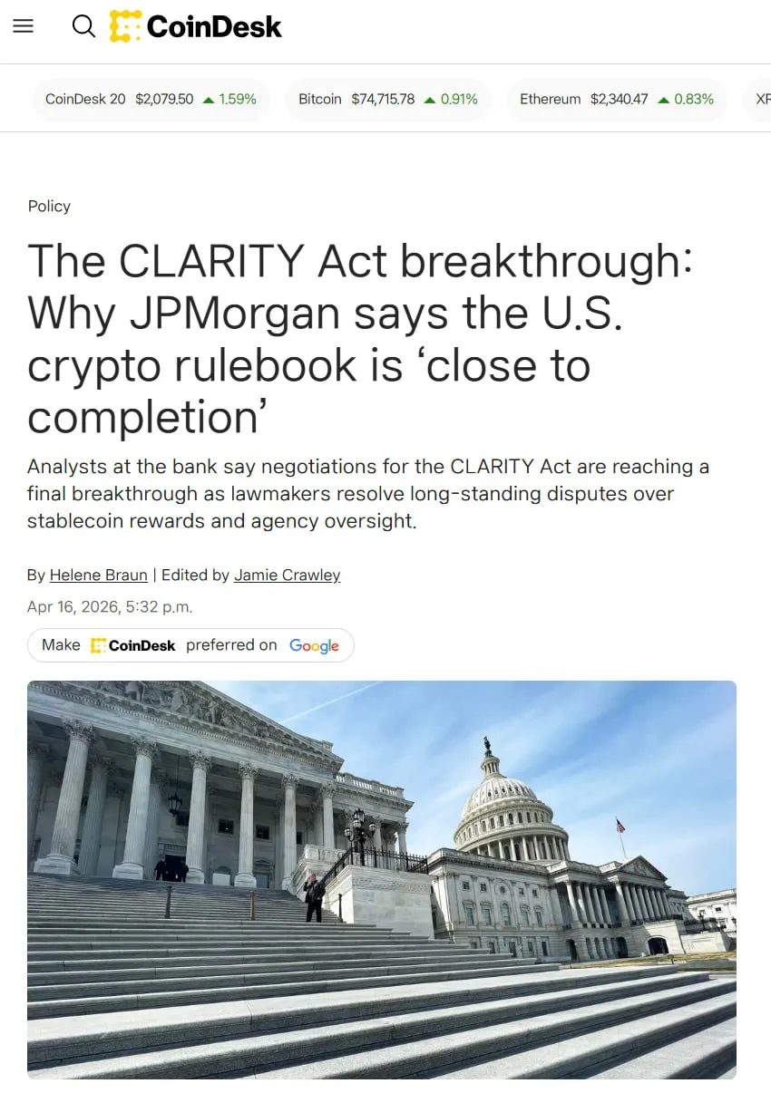 JPモルガンは、米暗号資産市場構造法(CLARITY)の交渉が最終合意に直面しており、未解決の争点は残りわずかであると、最近の報告書で評価したとCoinDeskが報じた。同メディアによると、ある高官は「議論となっていた項目が従来の12項目前後から最近では2〜3項目に減少し、最も議論が大きかったステーブルコインの利子に関する協議も順調に進んでいる」と伝えた。
