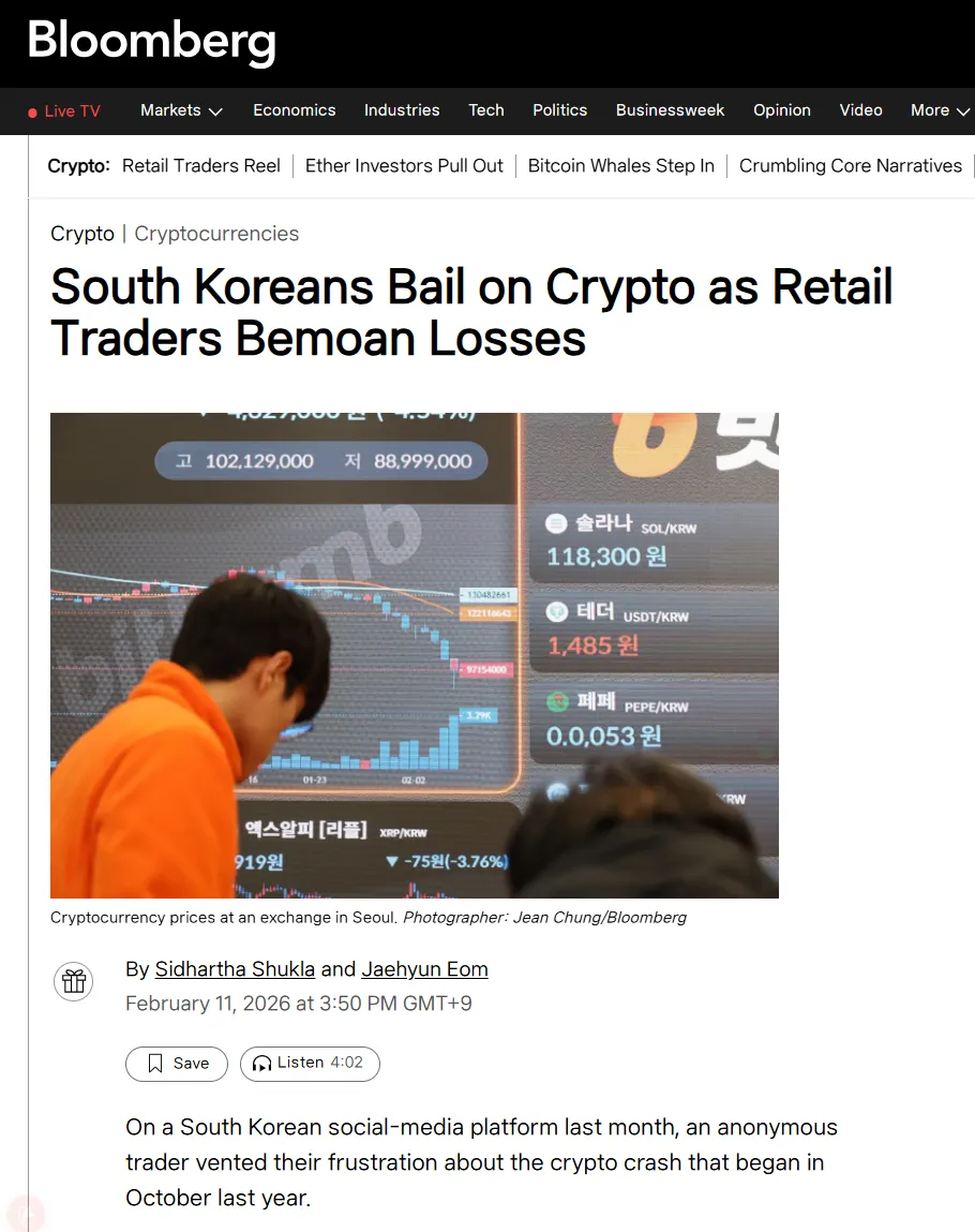 韓国の個人投資家が昨年10月からの暗号資産価格の下落を受け、市場から大量に離脱していると、ブルームバーグ(Bloomberg)が報じた。