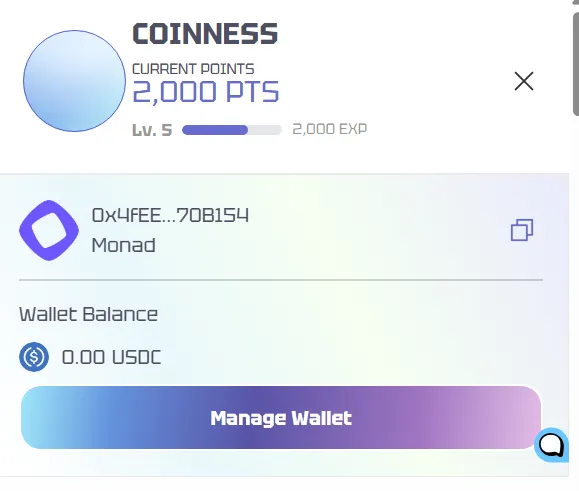 (3) 画面右上のプロフィールボタンを押した後に表示される財布アドレスでモナドチェーンUSDC入金