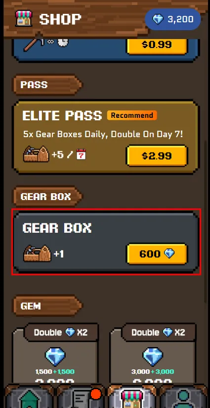 (4)ダイヤを集めた後、「SHOP」タブでGEAR BOXを購入して機器を収集する