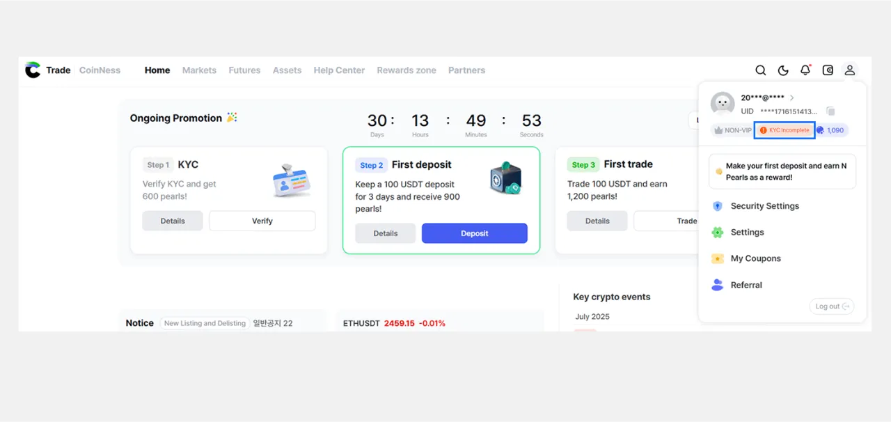 2. [Профайл] цэс рүү орж, нүүр хуудасны [KYC хийгдээгүй] гэсэн тэмдэг дээр дарна уу. (Хэрэв та биржийн нөхцөл, журамтай хараахан зөвшөөрөөгүй бол, эхлээд зөвшөөрөх шаардлагатай.)