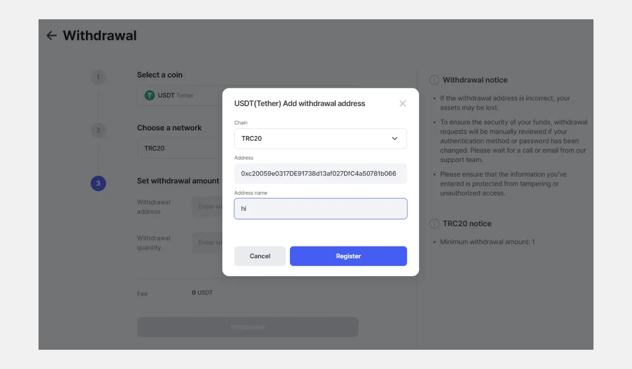 3. Сүлжээ (chain), хэтэвчний хаяг болон хаягийн нэрийг оруулж бүртгэлээ дуусгана.