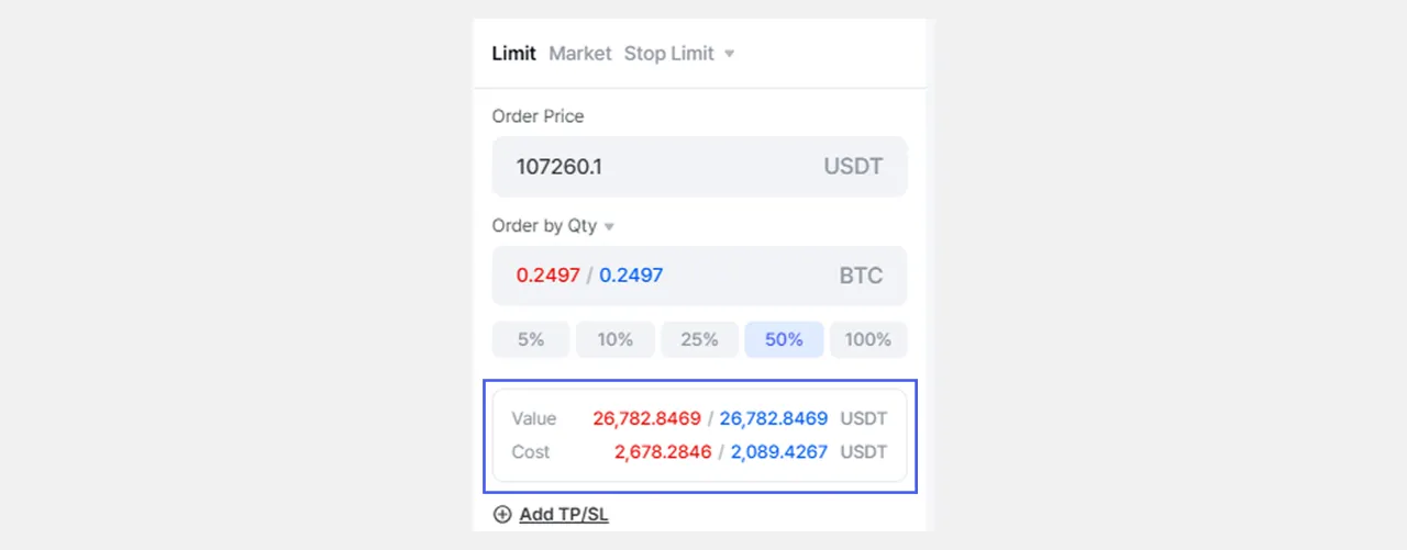 💡Таны сонгосон оруулгын аргаас хамааран ордерын хэмжээ болон маржин автоматаар тооцоологдож харагдана. • Хэмжээ / Үнэ цэнэ ◦ Та оруулсан хэмжээг өөр валют руу хөрвүүлсэн дүнг харна. • Зардал (Маржин) ◦ Байр суурь нээхэд ашиглагдах маржины хэмжээг шалгана.