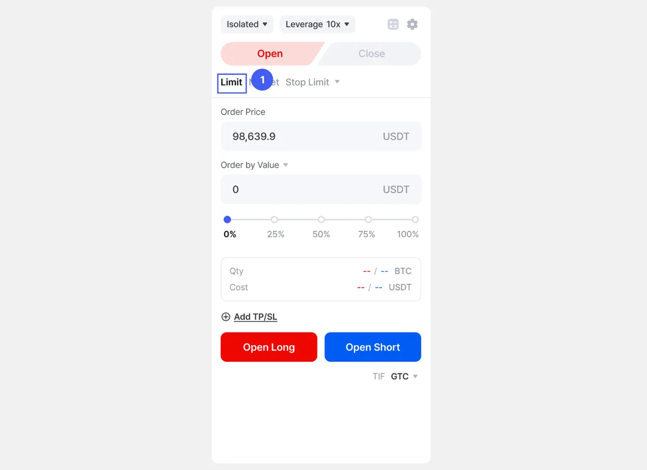 1. [Futures] хуудсан дээр ордерын самбар руу орж Limit төрлийг сонгоно уу.