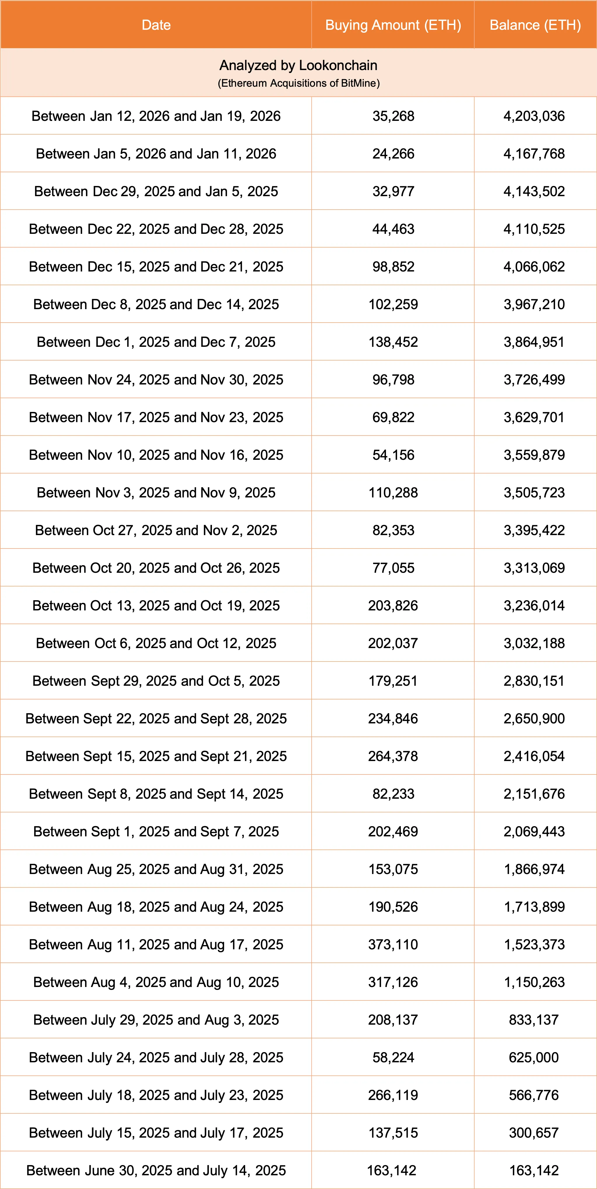 Bitmain (BMNR) announced it purchased an additional 35,268 ETH, valued at $109 million, last week. As of Jan. 19, the company's total holdings reached 4,203,036 ETH ($12.96 billion), representing 3.48% of the circulating supply, with an average purchase price of $3,211. Additionally, Bitmain is staking 1,838,003 ETH ($5.9 billion).