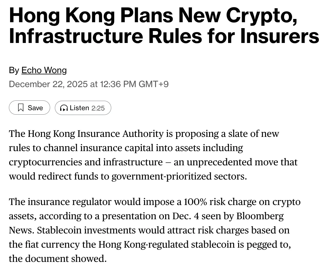 The Hong Kong Insurance Authority (HKIA) has released a legislative proposal that would allow insurance capital to be invested in cryptocurrencies and related infrastructure, Bloomberg reported. The proposal includes a 100% risk weighting for cryptocurrencies, while the weighting for stablecoins would depend on their underlying pegged assets. The plan is scheduled for public and industry consultation from February to April 2026, after which it will be submitted to the legislature. Bloomberg added that Hong Kong has been actively developing regulations to support cryptocurrency and stablecoin development as part of its push to become a digital finance hub.