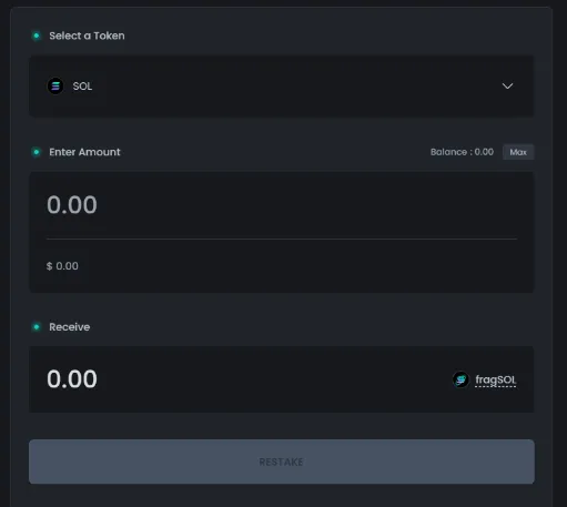 (2) Go to the 'Restake' tab on the left side of the screen and select fragSOL to deposit
