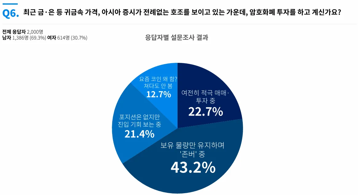 코인니스와 크라토스가 공동 진행하고 있는 주간 국내 투자자 시장 동향 정기 설문조사에 따르면 응답자 38.1%(전주 46.0%)가 다음 주 비트코인이 상승 혹은 급등할 것으로 전망했다. 횡보를 예상한 응답자는 31%(전주 31.2%), 하락과 급락을 예상한 응답자는 30.9%(전주 22.8%)를 차지했다. 약세 전망이 확대되고, 낙관 전망은 소폭 축소됐다. 시장 심리를 묻는 질문에는 가장 많은 36.4%가 중립이라고 답했다. 낙관 혹은 극단적 낙관이라고 답한 비중은 32.3%, 공포 혹은 극단적 공포라고 답한 비중은 31.3%를 기록했다. 금·은 등 귀금속 가격과 아시아 증시가 전례없는 호조를 보이고 있는 가운데, 암호화폐 투자 지속 여부를 묻는 질문에는 응답자 중 가장 많은 43.2%가 '보유 물량만 유지하며 버티는 중'이라고 답했다. 22.7%는 '여전히 적극 매매 및 투자 중', 21.4%는 '포지션은 없지만 진입 기회 엿보는 중', 12.7%는 '코인은 쳐다도 안 봄'이라고 답했다.